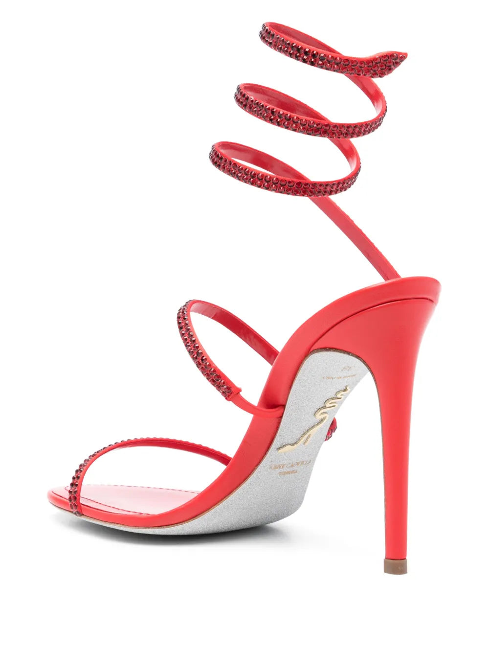 The signature style is now reimagined in red. Exquisitely decorated with tone-on-tone crystals applied on straps and the serpent, the Cleo sandal exudes glamor and charm.