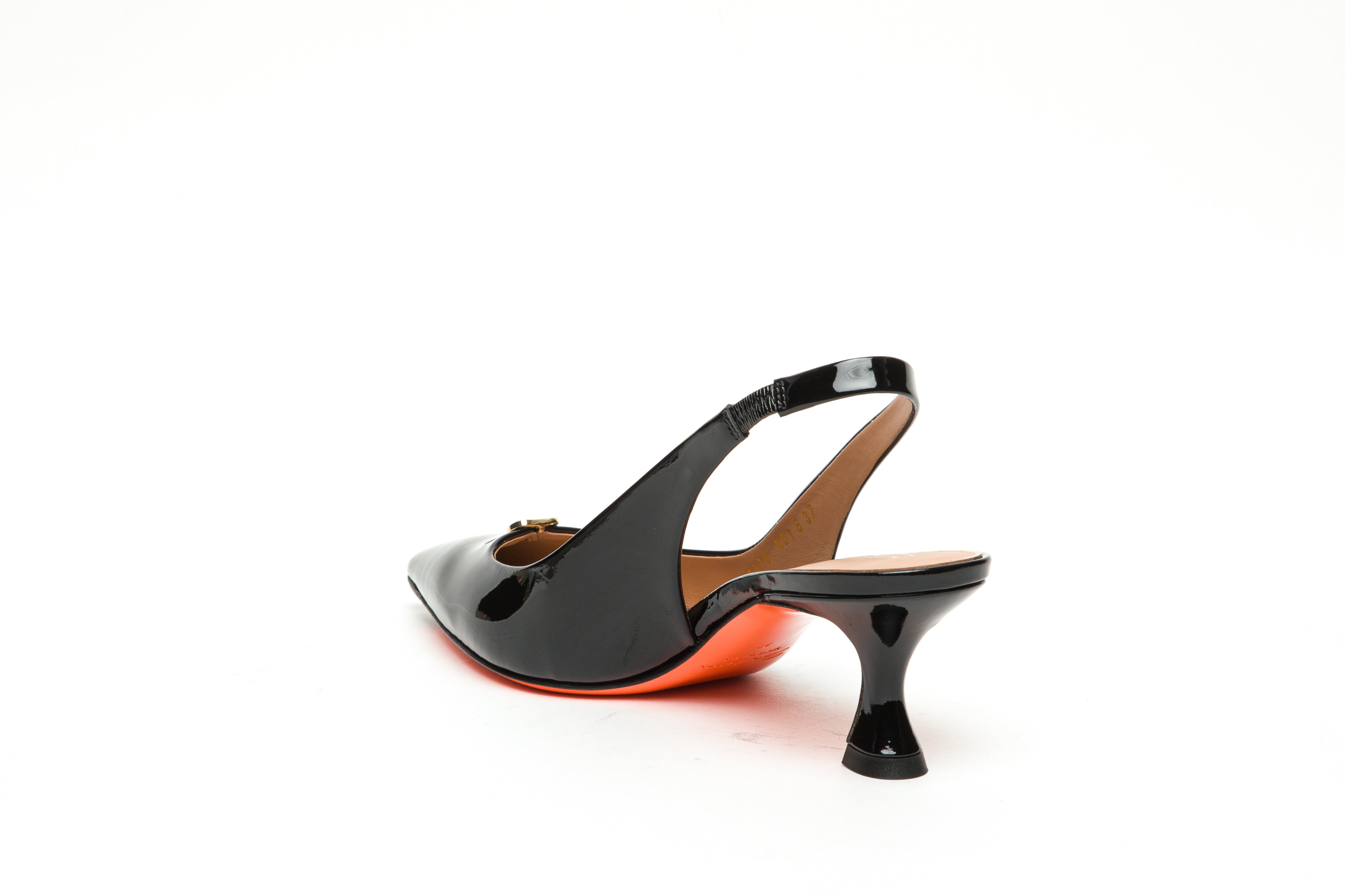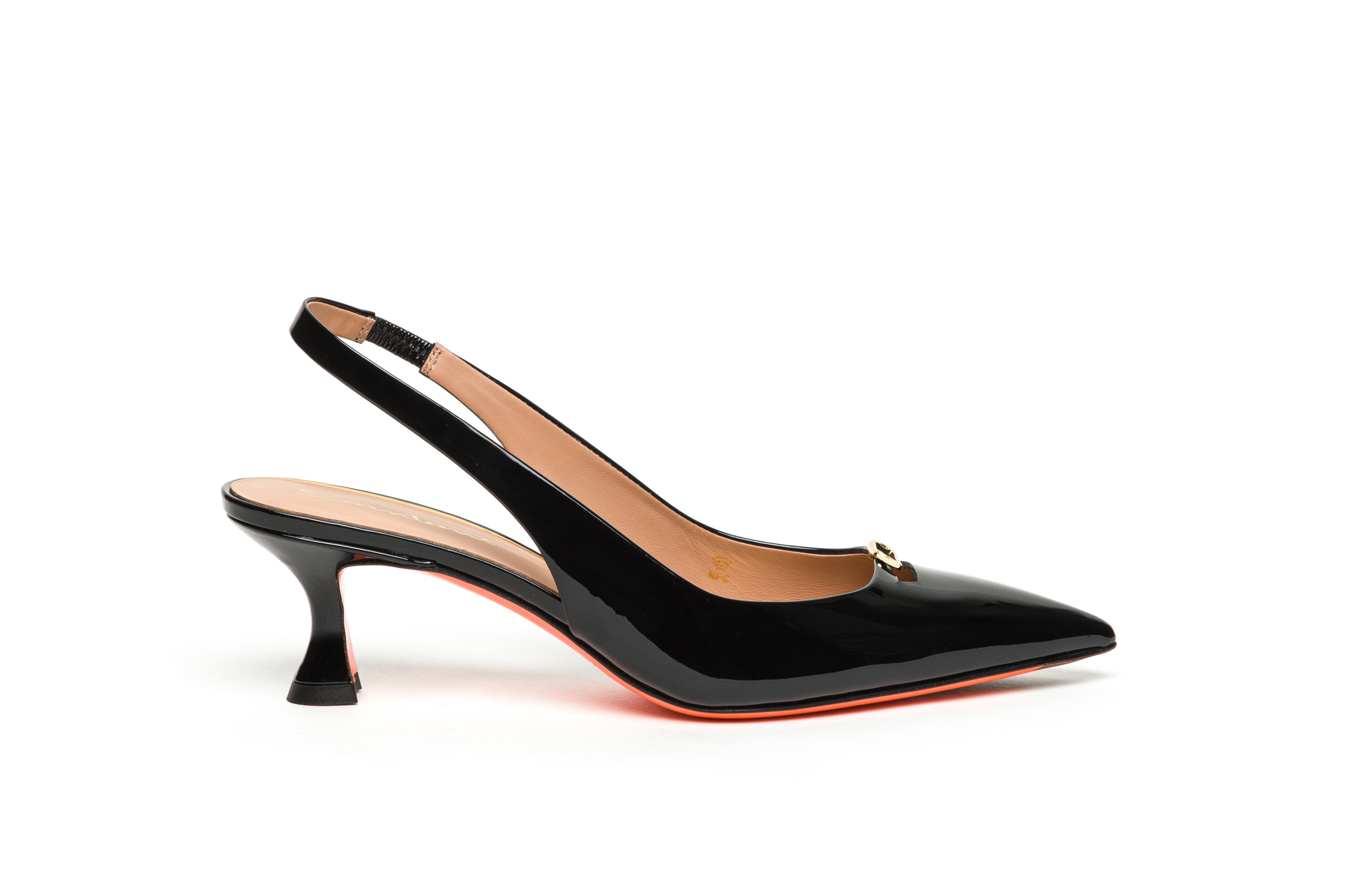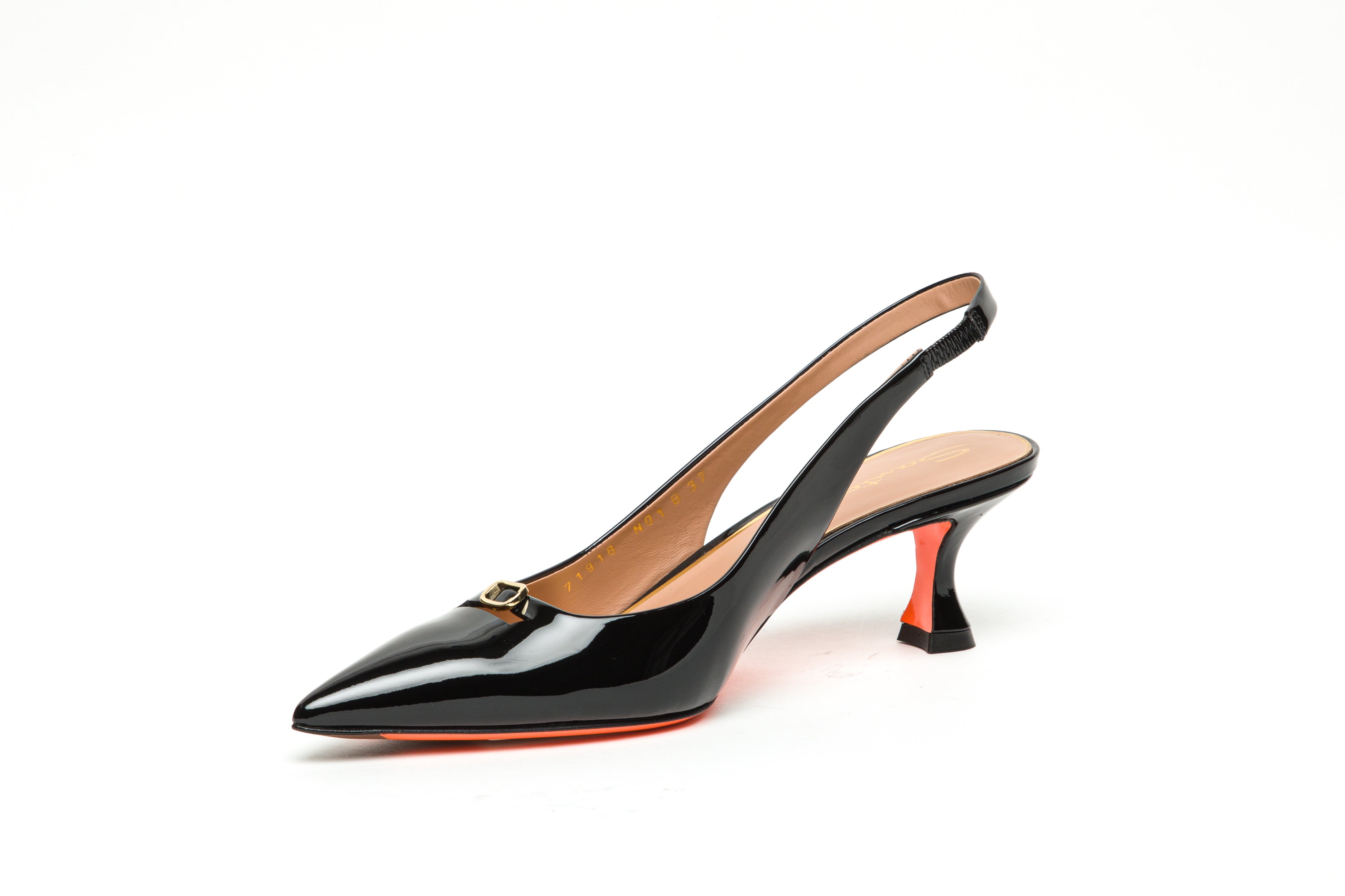 This pump unites understated sophistication with a feminine take on Santoni’s heritage style codes. Patent leather illuminates the lines of its sleek tapered silhouette with spool heel, bringing effortless elegance to any outfit. Embellished with a delicate metal buckle as a discreet homage to one of the Maison’s hallmark symbols.